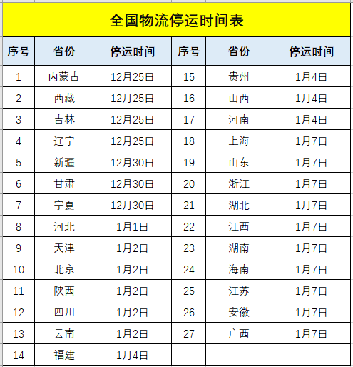 由于天氣寒冷以及霧霾天氣嚴重,今年全國物流停運時間比往年來得早。基于國家交通部、物流部等部門發(fā)出的通知,距離物流停運時間不多了,部分區(qū)域物流將于1月5日開始陸續(xù)放假停運,1月18日將全國大范圍停運。